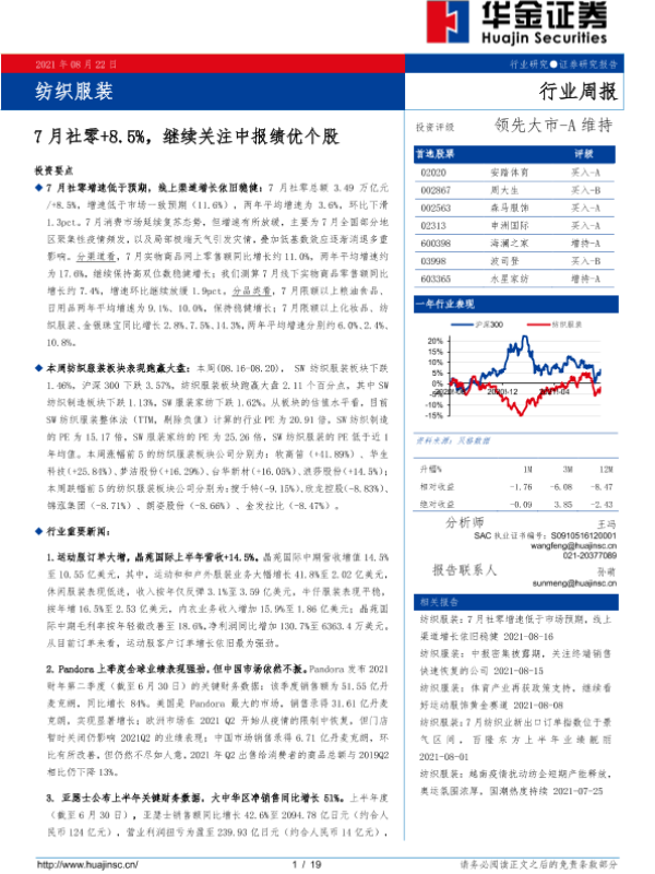 【华金证券】【20210822】20210822-华金证券-纺织服装行业周报:7月社零+8.5%,继续关注中报绩优个股-19页 行业研究