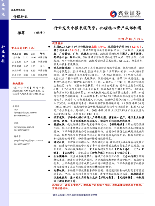 【兴业证券】【20210829】20210829-兴业证券-传媒行业周报:行业龙头中报表现优秀,把握核心资产底部机遇-17页 行业研究