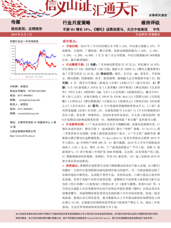 【山西证券】【20190802】20190802-山西证券-传媒行业月度策略:手游H1增长18%,《哪吒》成票房黑马,关注中报表现-24页 行业研究