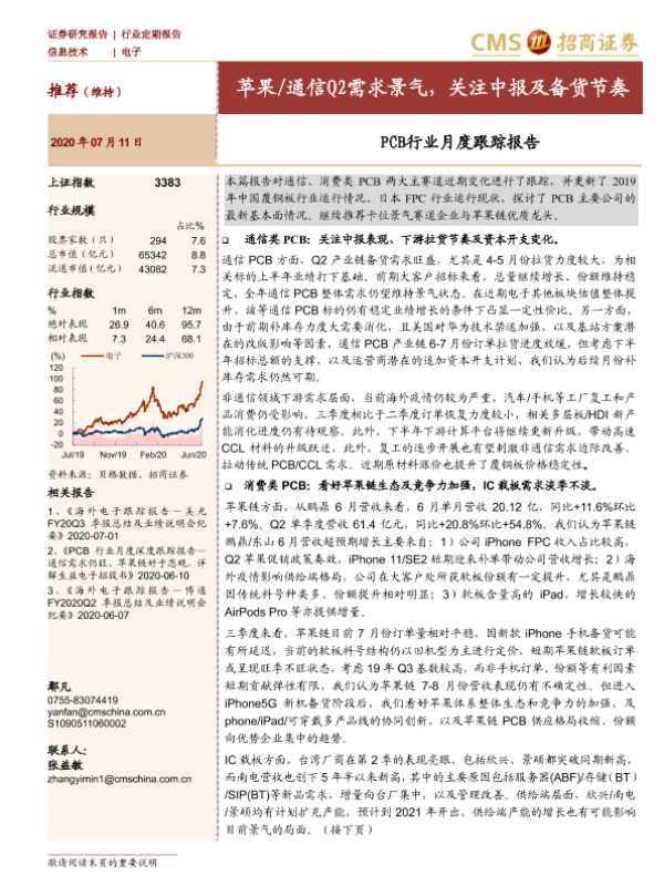 【海通证券】【20200711】20200711-招商证券-PCB行业月度跟踪报告:苹果 通信Q2需求景气,关注中报及备货节奏-26页 行业研究