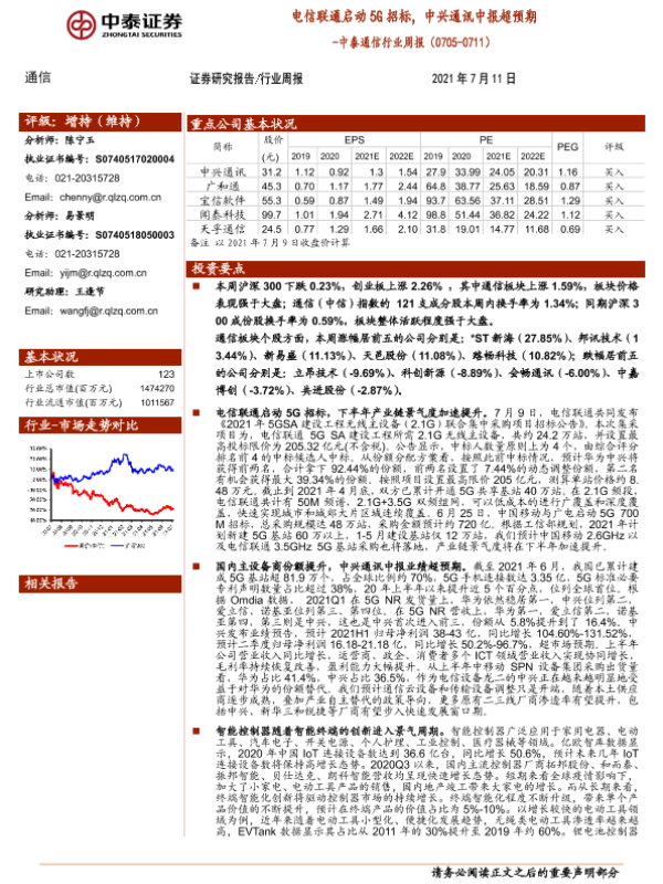 【中泰证券】【20210711】中泰证券-中泰通信行业周报:电信联通启动5G招标,中兴通讯中报超预期-14页 行业研究
