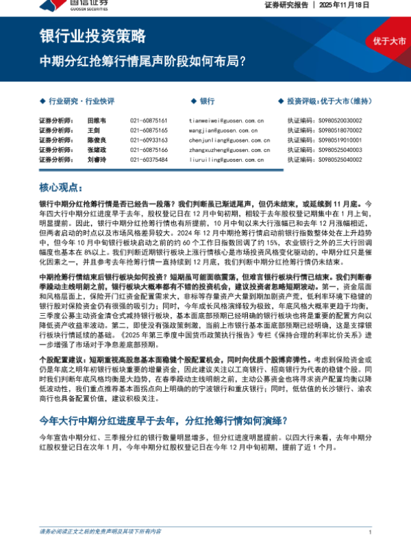 【国信证券】【202511】银行业投资策略:中期分红抢筹行情尾声阶段如何布局?-7页 证券期货研究报告