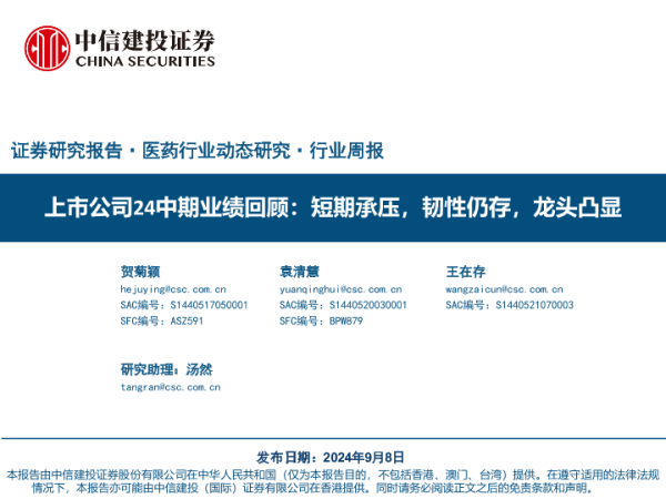 【中信建投证券】【20240908】2024年09月23日更新-【中信建投】医药行业周报-上市公司24中期业绩回顾:短期承压,韧性仍存,龙头凸显-96页 行业研究