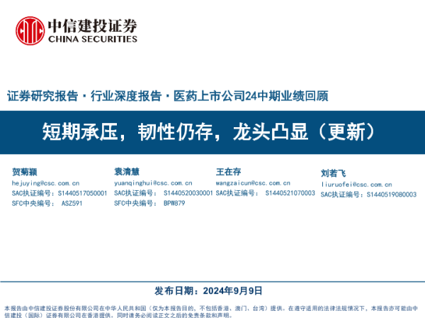 【中信建投证券】【20240909】医药行业医药上市公司24中期业绩回顾:短期承压,韧性仍存,龙头凸显(更新)-116页 行业研究