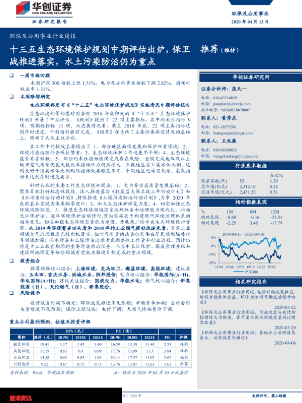 【华创证券】【20200413】环保及公用事业行业周报:十三五生态环境保护规划中期评估出炉,保卫战推进落实,水土污染防治仍为重点-24页 行业研究