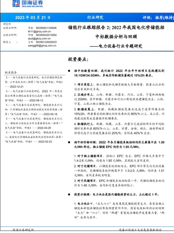 【国海证券】【20230321】储能行业跟踪报告2:2022年我国电化学储能招中标数据分析与回顾-35页 行业研究