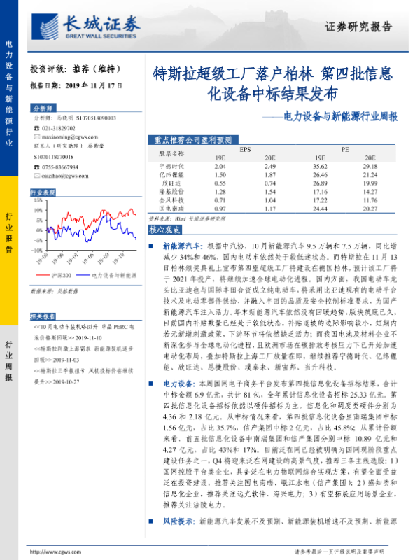 【长城证券】【20191117】20191117-长城证券-电力设备与新能源行业周报:特斯拉超级工厂落户柏林 第四批信息化设备中标结果发布-16页 行业研究