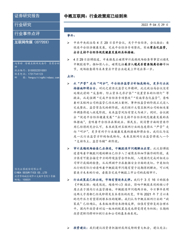 【信达证券】【20220429】中概互联网:行业政策底已经到来-9页 行业研究