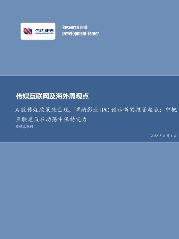 【信达证券】【20220801】20220801-信达证券-传媒互联网及海外周观点:A股传媒政策底已现,博纳影业IPO预示新的投资起点;中概互联建议在动荡中保持定力-20页 行业研究