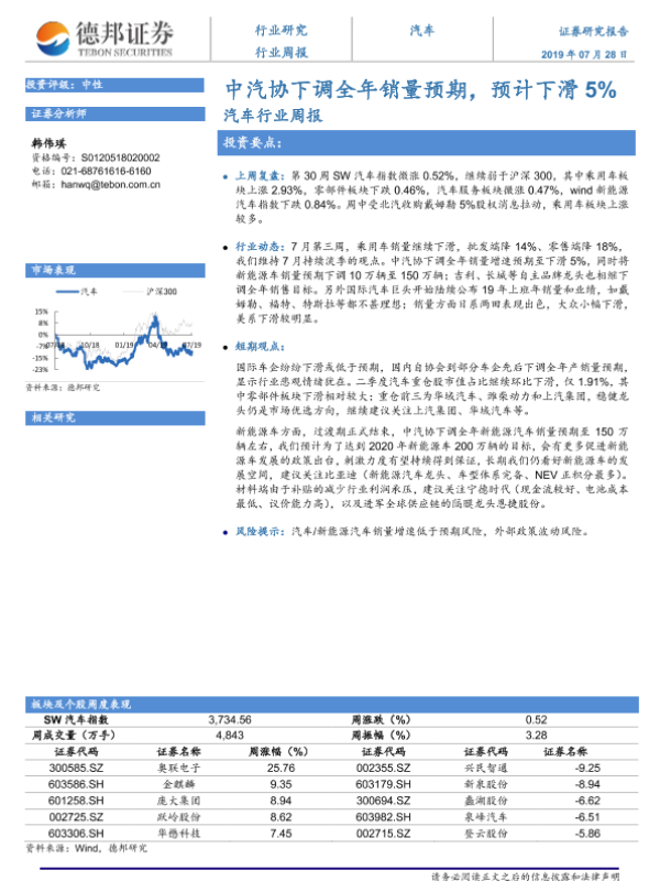 【德邦证券】【20190728】20190728-德邦证券-汽车行业周报:中汽协下调全年销量预期,预计下滑5%-9页 行业研究