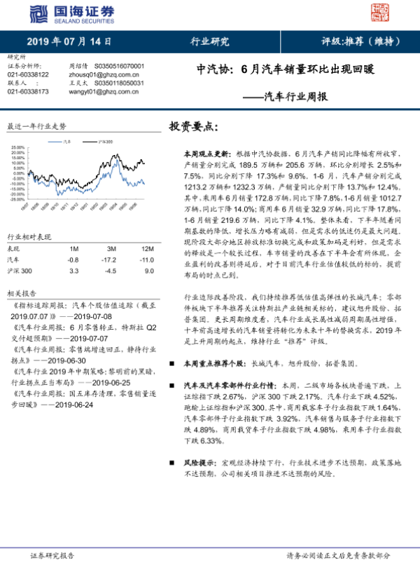 【国海证券】【20190714】20190714-国海证券-汽车行业周报:中汽协:6月汽车销量环比出现回暖-19页 行业研究
