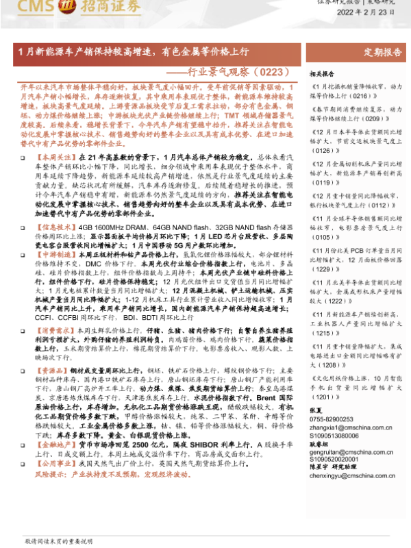 【海通证券】【20220223】行业景气观察:1月新能源车产销保持较高增速,有色金属等价格上行-32页 行业研究