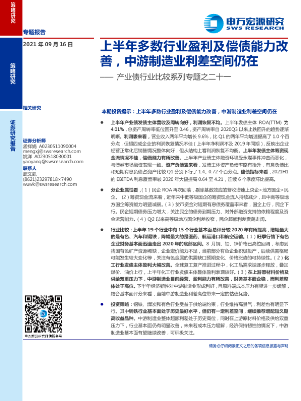 【申万宏源】【20210916】产业债行业比较系列专题之二十一:上半年多数行业盈利及偿债能力改善,中游制造业利差空间仍在-22页 行业研究