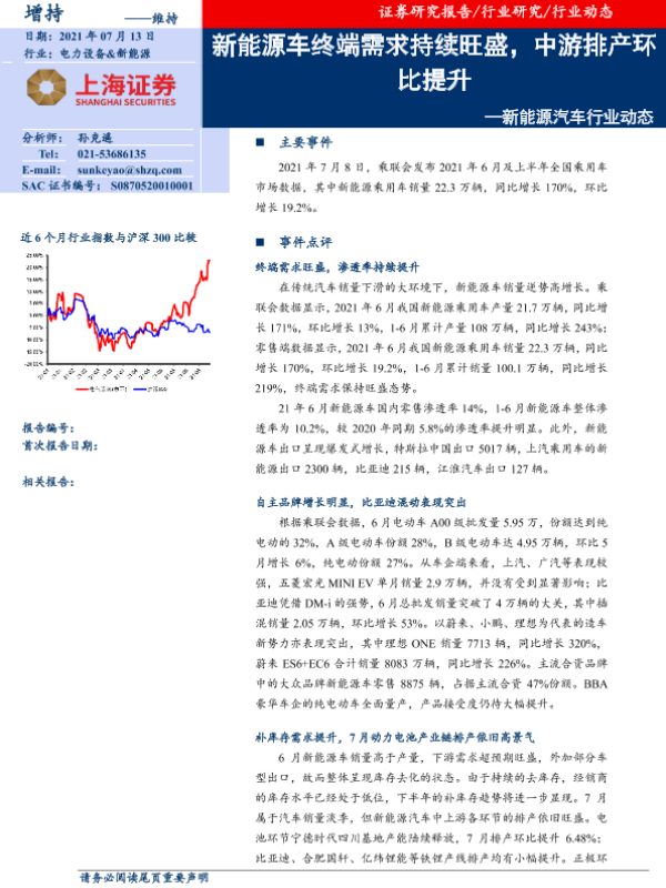 【上海证券】【20210713】新能源汽车行业动态:新能源车终端需求持续旺盛,中游排产环比提升-3页 行业研究