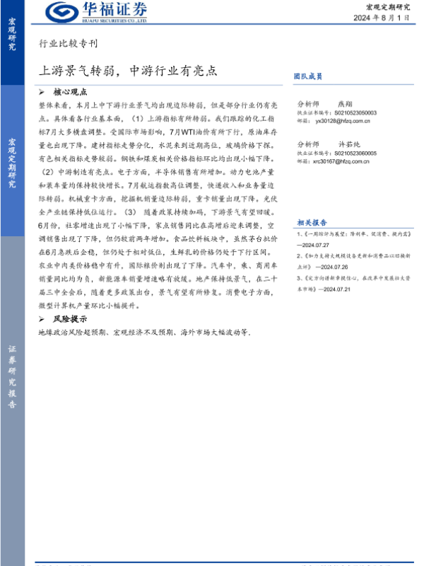 【华福证券】【20240801】行业比较专刊:上游景气转弱,中游行业有亮点-20页 行业研究