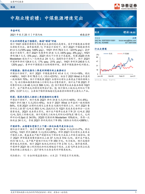 【华泰证券】【20210625】煤炭中期业绩前瞻:中煤能源增速突出-6页 行业研究