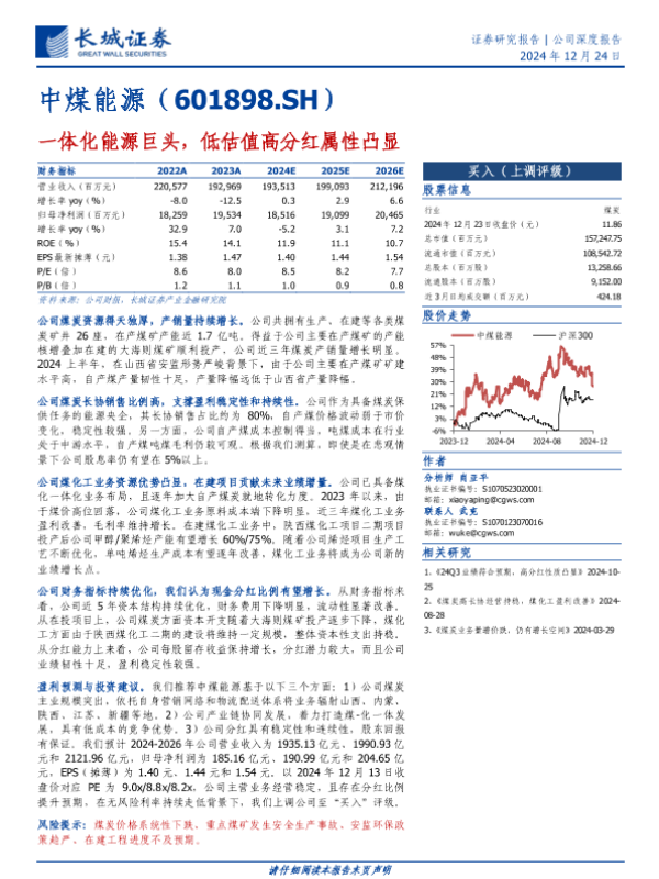 【长城证券】【20241224】中煤能源-601898.SH-一体化能源巨头,低估值高分红属性凸显-36页 行业研究