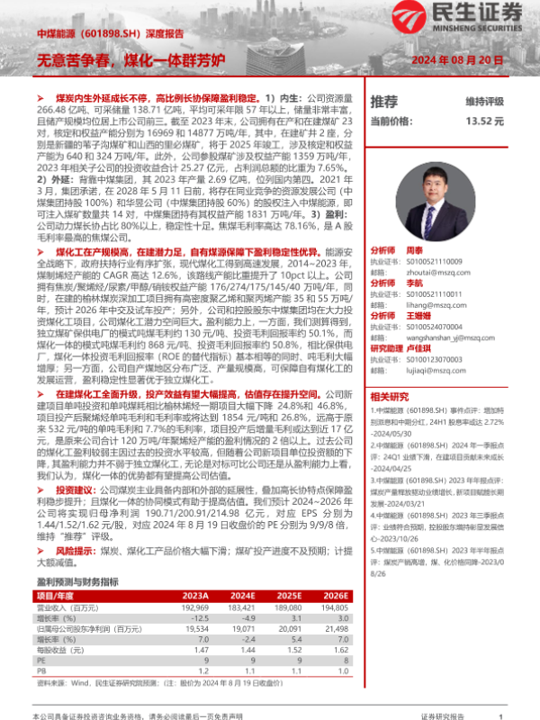 【民生证券】【20240820】中煤能源-601898.SH-深度报告:无意苦争春,煤化一体群芳妒-32页 行业研究