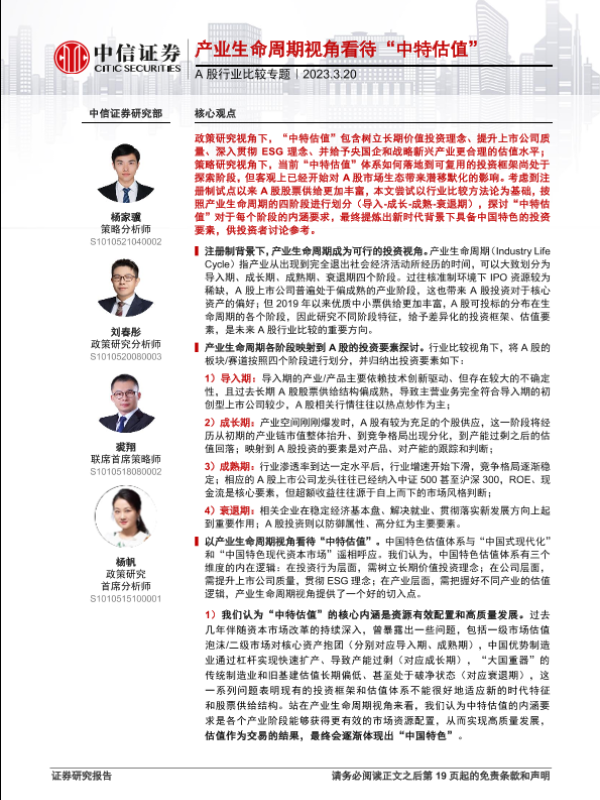【中信证券】【20230320】A股行业比较专题:产业生命周期视角看待“中特估值”-20页 行业研究