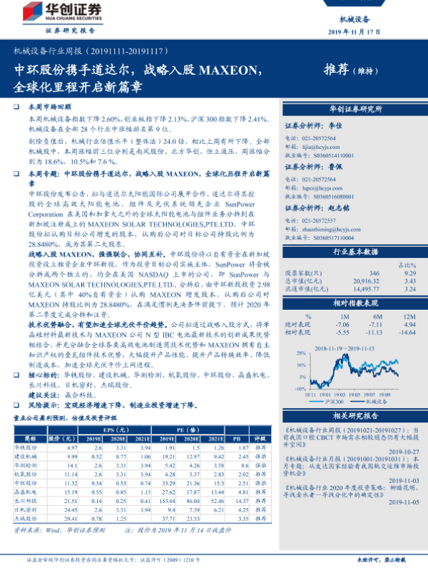 【华创证券】【20191117】20191117-华创证券-机械设备行业周报:中环股份携手道达尔,战略入股MAXEON,全球化里程开启新篇章-19页 行业研究