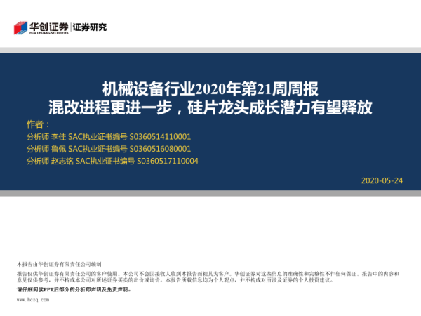 【华创证券】【20200524】机械设备行业2020年第21周周报:混改进程更进一步,硅片龙头成长潜力有望释放-25页 行业研究