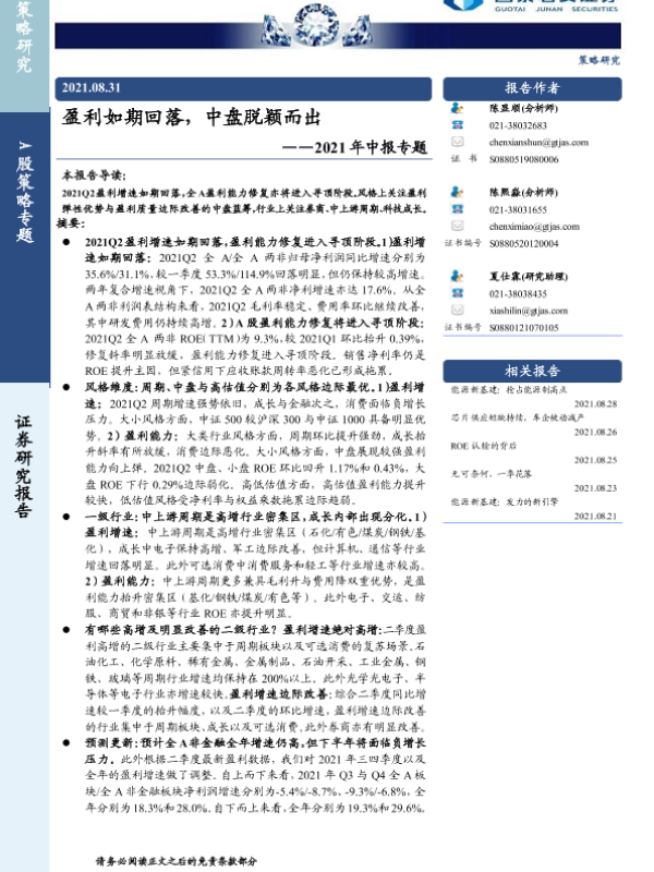 【国泰君安证券】【20210831】2021年中报专题:盈利如期回落,中盘脱颖而出-21页 行业研究