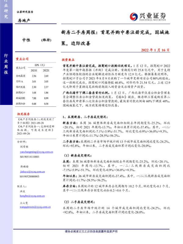【兴业证券】【20220116】新房二手房周报:首笔并购中票注册完成,因城施策,边际改善-26页 行业研究