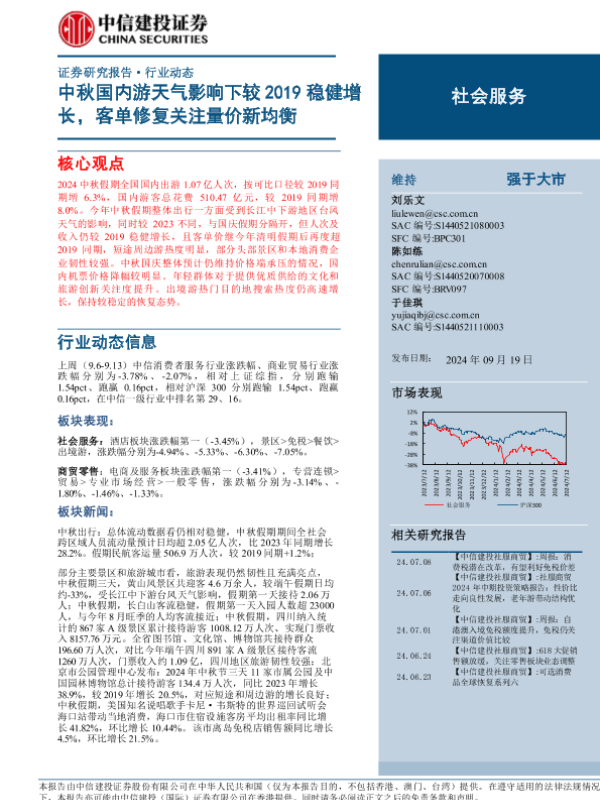【中信建投证券】【20240919】2024年10月11日更新-【中信建投】社会服务行业:中秋国内游天气影响下较2019稳健增长,客单修复关注量价新均衡-27页 行业研究