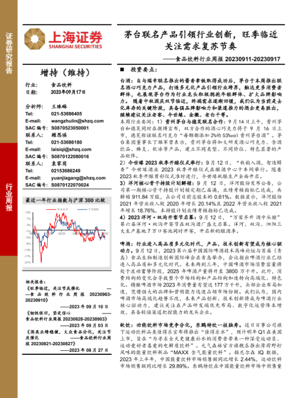 【上海证券】【20230917】20230917-上海证券-食品饮料行业周报:茅台联名产品引领行业创新,旺季临近关注需求复苏节奏-20页 行业研究