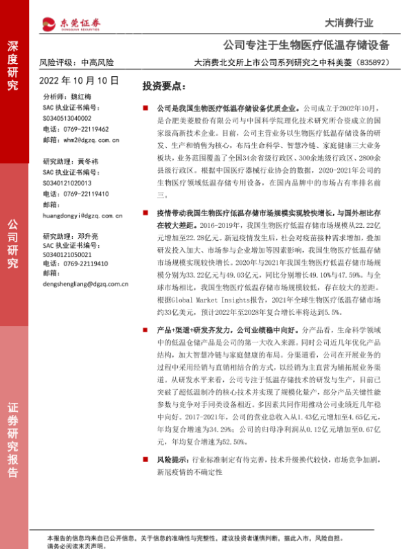 【东莞证券】【20221010】大消费北交所上市公司系列研究之中科美菱:公司专注于生物医疗低温存储设备-25页 行业研究