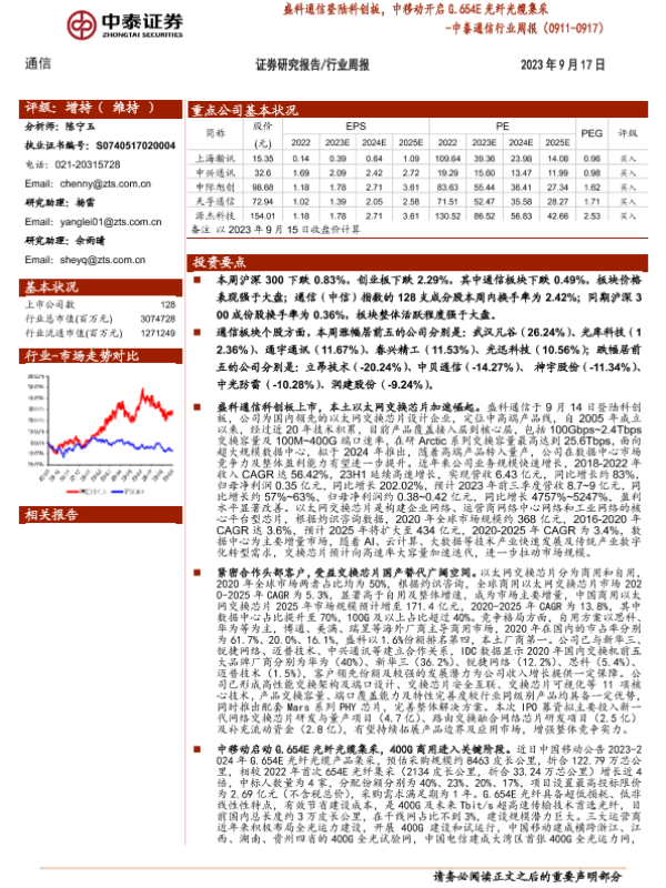 【中泰证券】【20230917】中泰通信行业周报:盛科通信登陆科创板,中移动开启G.654E光纤光缆集采-14页 行业研究