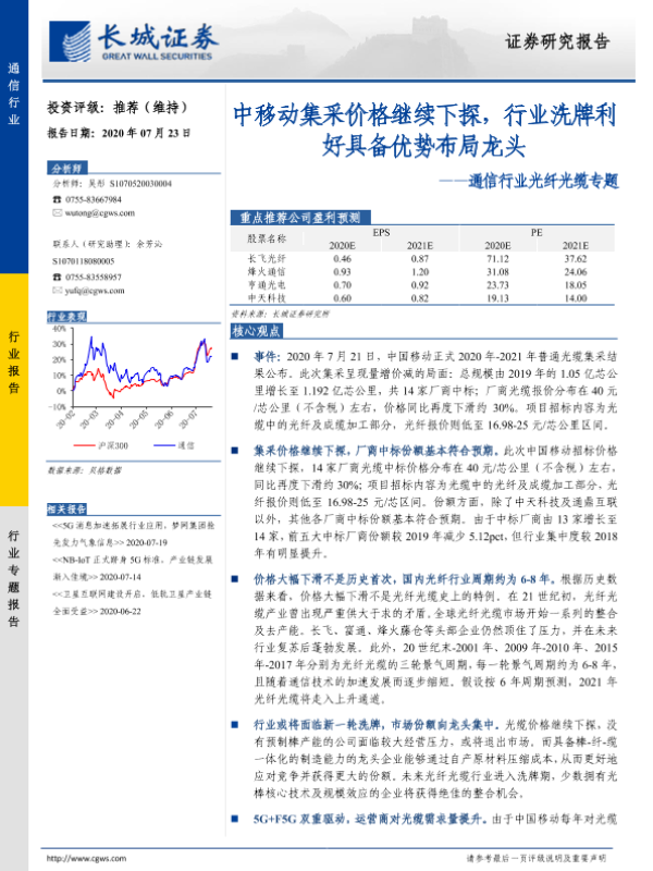 【长城证券】【20200723】通信行业光纤光缆专题:中移动集采价格继续下探,行业洗牌利好具备优势布局龙头-13页 行业研究