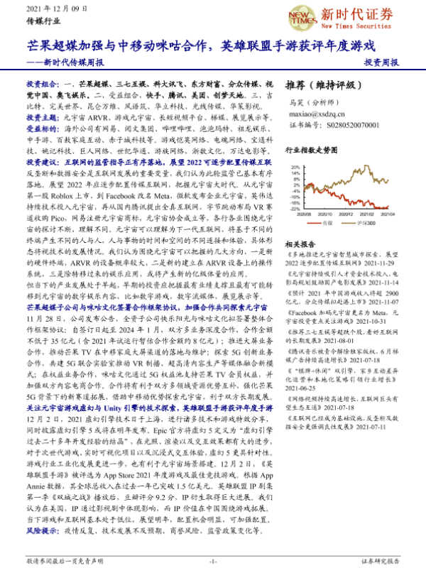 【新时代证券】【20211209】新时代传媒周报:芒果超媒加强与中移动咪咕合作,英雄联盟手游获评年度游戏-27页 行业研究