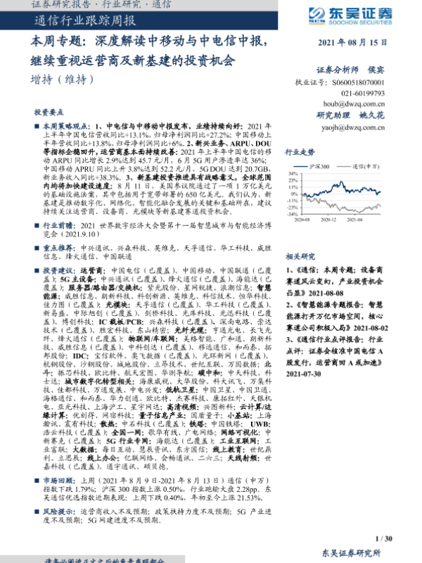 【东吴证券】【20210815】20210815-东吴证券-通信行业跟踪周报:本周专题:深度解读中移动与中电信中报,继续重视运营商及新基建的投资机会-30页 行业研究