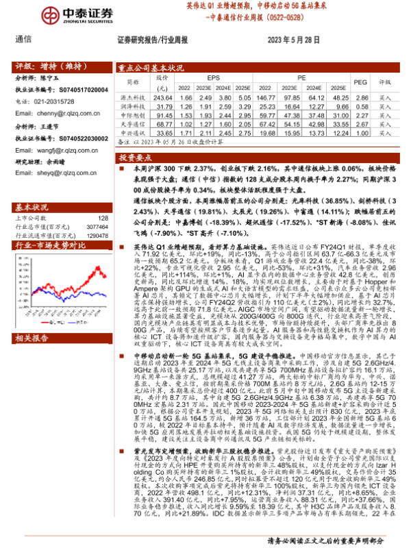 【中泰证券】【20230528】中泰证券-中泰通信行业周报:英伟达Q1业绩超预期,中移动启动5G基站集采-17页 行业研究