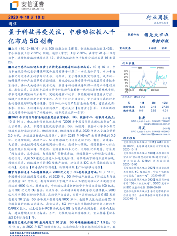 【安信证券】【20201018】20201018-安信证券-通信行业周报:量子科技再受关注,中移动拟投入千亿布局5G创新-21页 行业研究