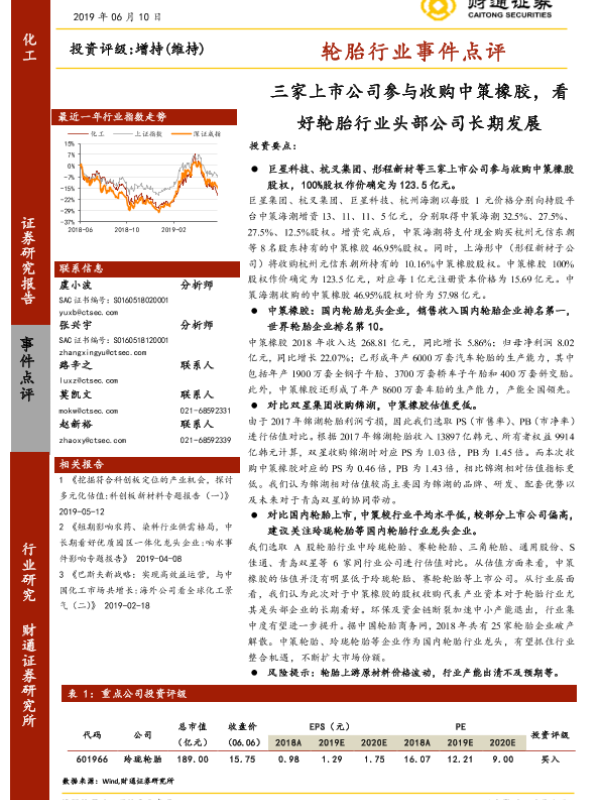 【财通证券】【20190610】20190610-财通证券-轮胎行业事件点评:三家上市公司参与收购中策橡胶,看好轮胎行业头部公司长期发展-8页 行业研究