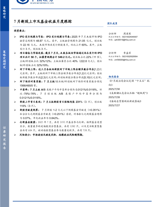 【华福证券】【202507】7月新股上市及基金收益月度跟踪-10页 证券期货研究报告
