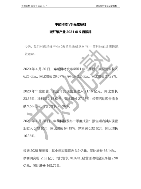 【并购优塾】【20210507】中简科技VS光威复材:碳纤维产业2021年5月跟踪-22页 行业研究