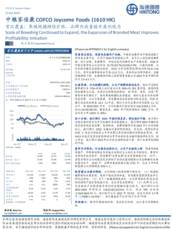 【海通国际】【20230113】中粮家佳康(01610)首次覆盖:养殖规模持续扩张,品牌肉放量提升盈利能力-27页 行业研究
