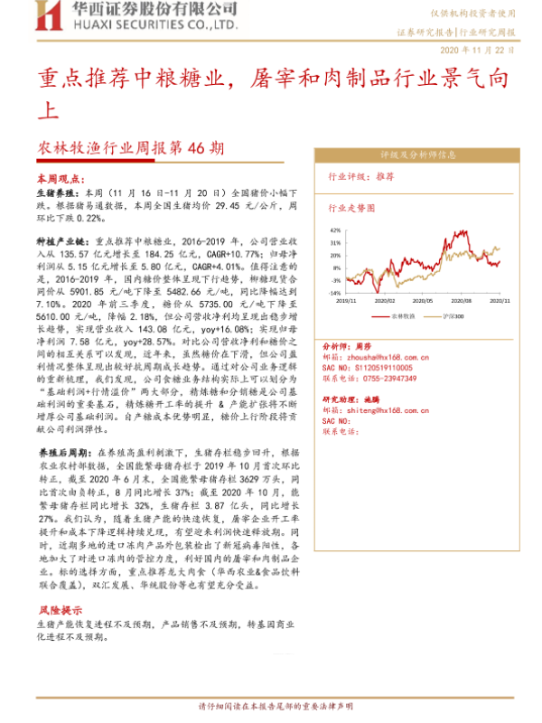 【华西证券】【20201122】20201122-华西证券-农林牧渔行业周报第46期:重点推荐中粮糖业,屠宰和肉制品行业景气向上-21页 行业研究