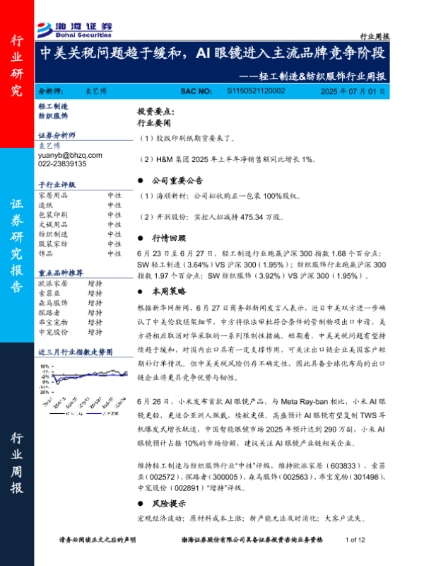 【渤海证券】【20250701】轻工制造&纺织服饰行业周报:中美关税问题趋于缓和,AI眼镜进入主流品牌竞争阶段-12页 行业研究