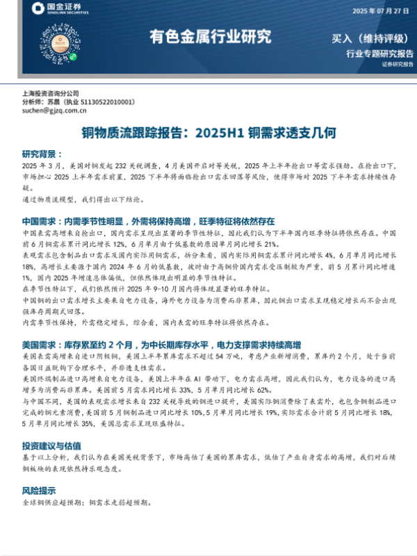 【国金证券】【202507】有色金属行业铜物质流跟踪报告:2025H1铜需求透支几何-10页 证券期货研究报告