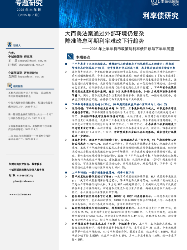 【中诚信国际】【202507】大而美法案通过外部环境仍复杂,降准降息可期利率难改下行趋势——2025年上半年货币政策与利率债回顾与下半年展望-13页 宏观策略
