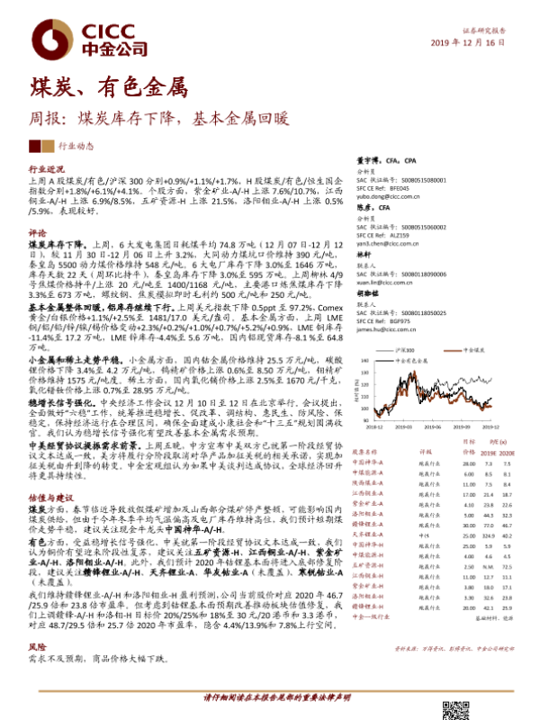 【中金公司】【20191216】20191216-中金公司-煤炭、有色金属周报:煤炭库存下降,基本金属回暖-15页 行业研究