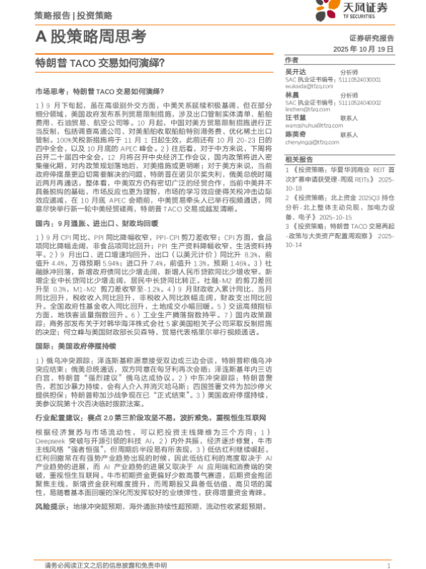 【天风证券】【202510】A股策略周思考 | 投资策略-21页 证券期货研究报告