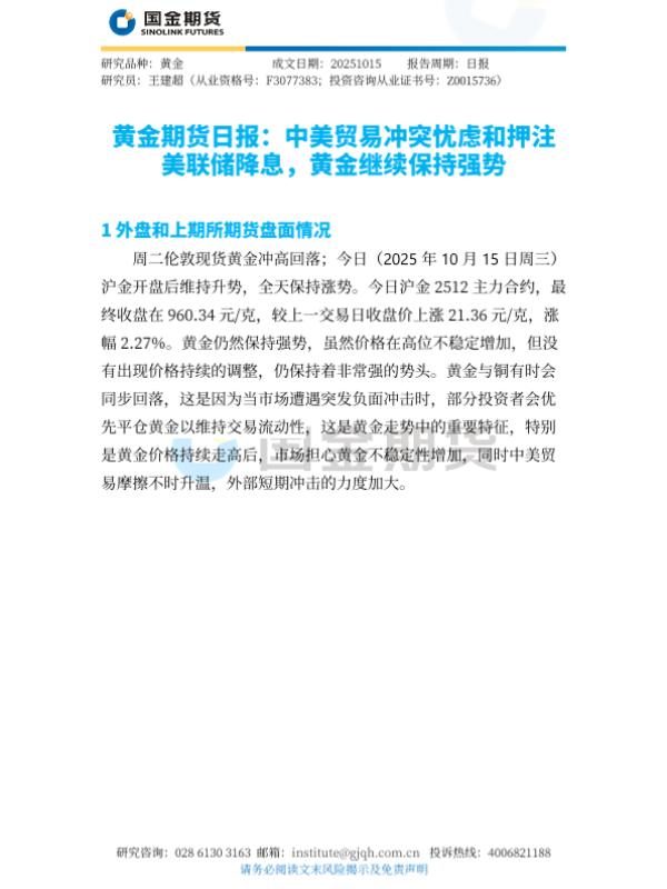 【国金期货】【202510】黄金期货日报 中美贸易冲突忧虑和押注美联储降息,黄金继续保持强势-4页 证券期货研究报告
