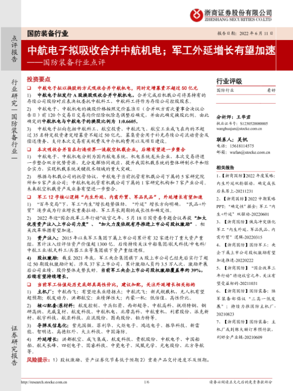【浙商证券】【20220611】国防装备行业点评:中航电子拟吸收合并中航机电;军工外延增长有望加速-6页 行业研究