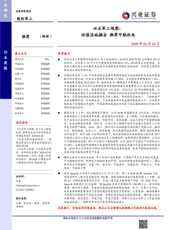 【兴业证券】【20200216】兴业军工观察:估值洼地掘金推荐中航机电-14页 行业研究
