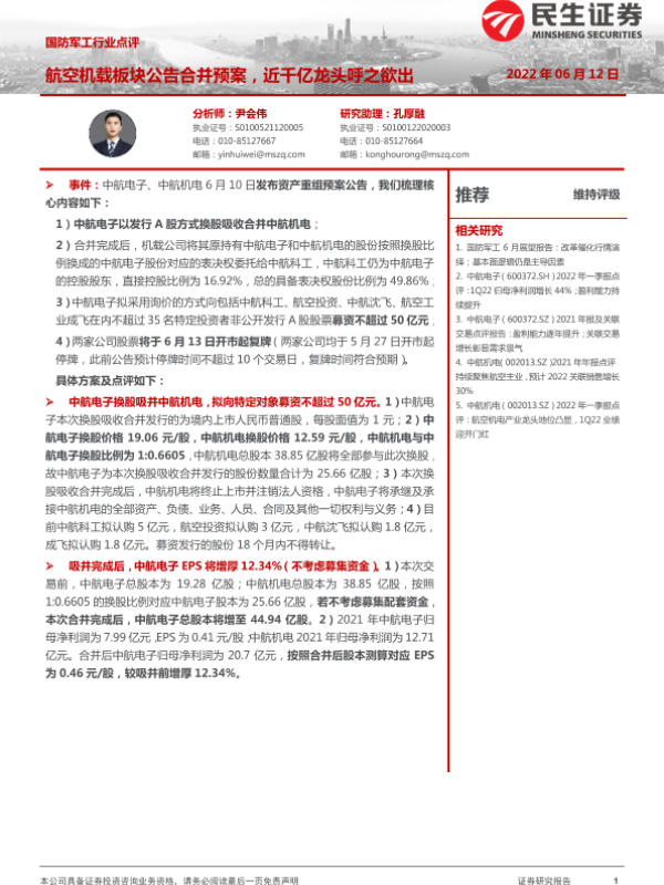 【民生证券】【20220612】国防军工行业点评:航空机载板块公告合并预案,近千亿龙头呼之欲出-3页 行业研究
